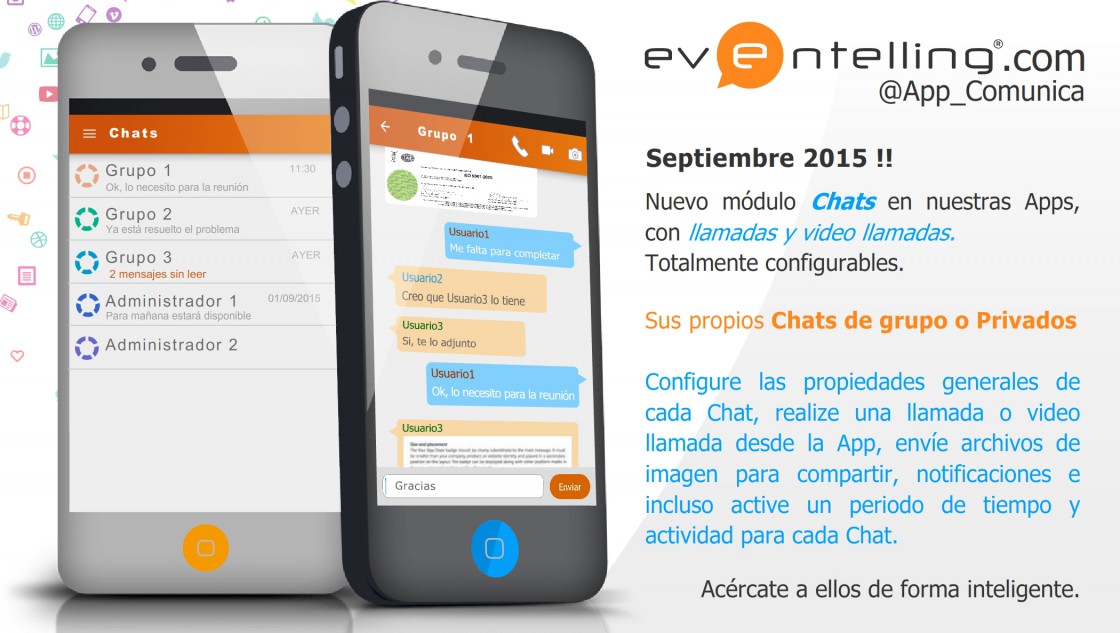 Chats individuales o en grupo totalmente administrables e integrados en vuestras Apps de comunicación Eventelling.com